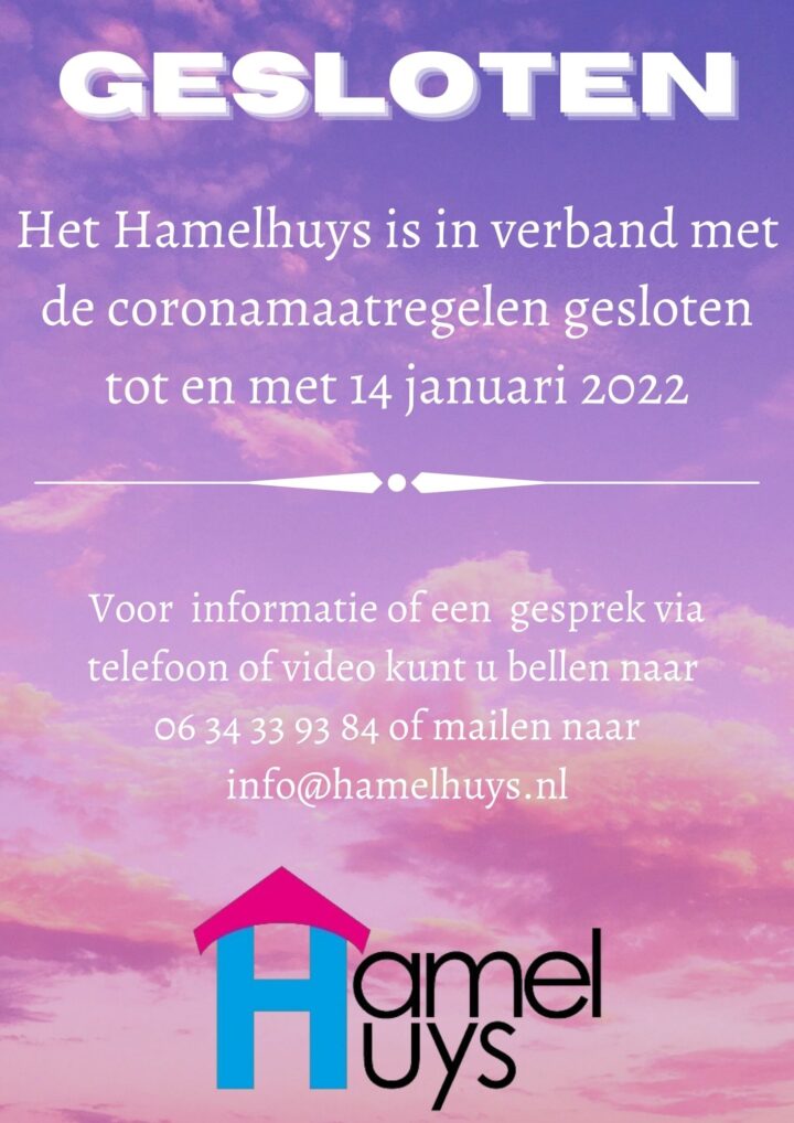 Als gevolg van de algehele lockdown is ons inloophuis gesloten tot en met 14 januari 2022. Mocht u behoefte hebben aan een persoonlijk gesprek via telefoon of video, laat ons dat dan weten via 06-34339384 of info@hamelhuys.nl