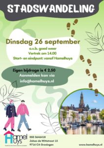 Dinsdag 26 september vertrekt er vanaf Hamelhuys, onder voorbehoud van goed weer, een stadswandeling incl. begeleiding. De wandeling duurt max. 1,5 uur en zal weer eindigen bij Hamelhuys.