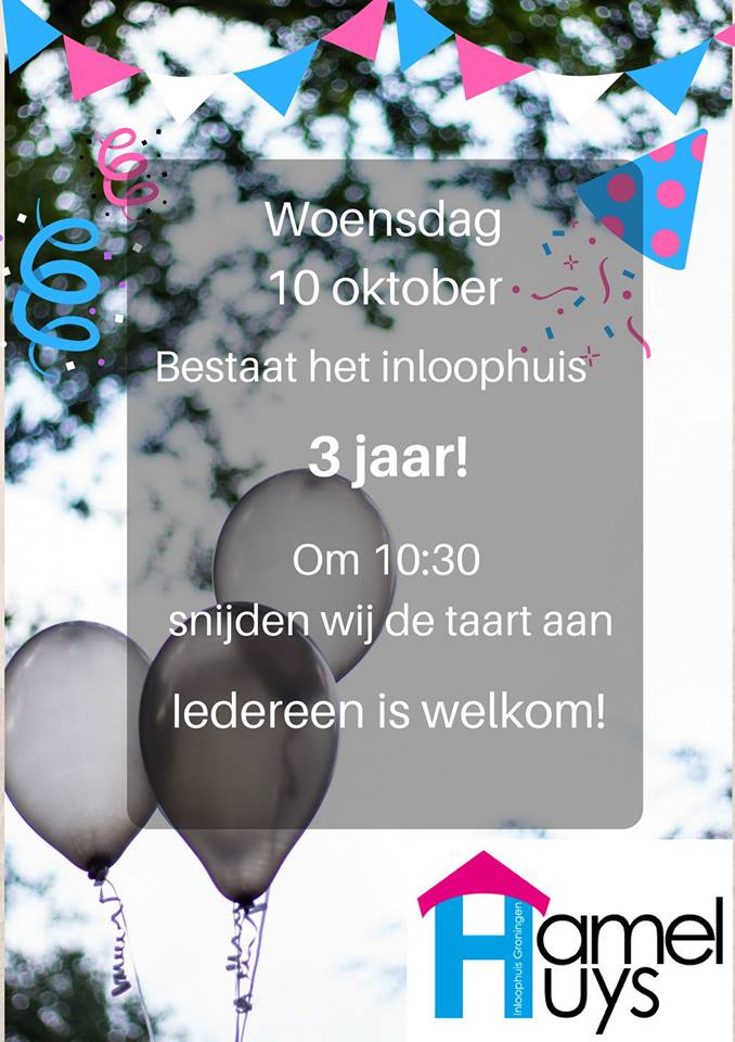Woensdag 10 oktober bestaat het Hamelhuys 3 jaar! Wij nodigen je graag uit om dit samen met ons te vieren. Om 10:30 uur komt wethouder Van der Schaaf onze Hamelhuys taart aansnijden.